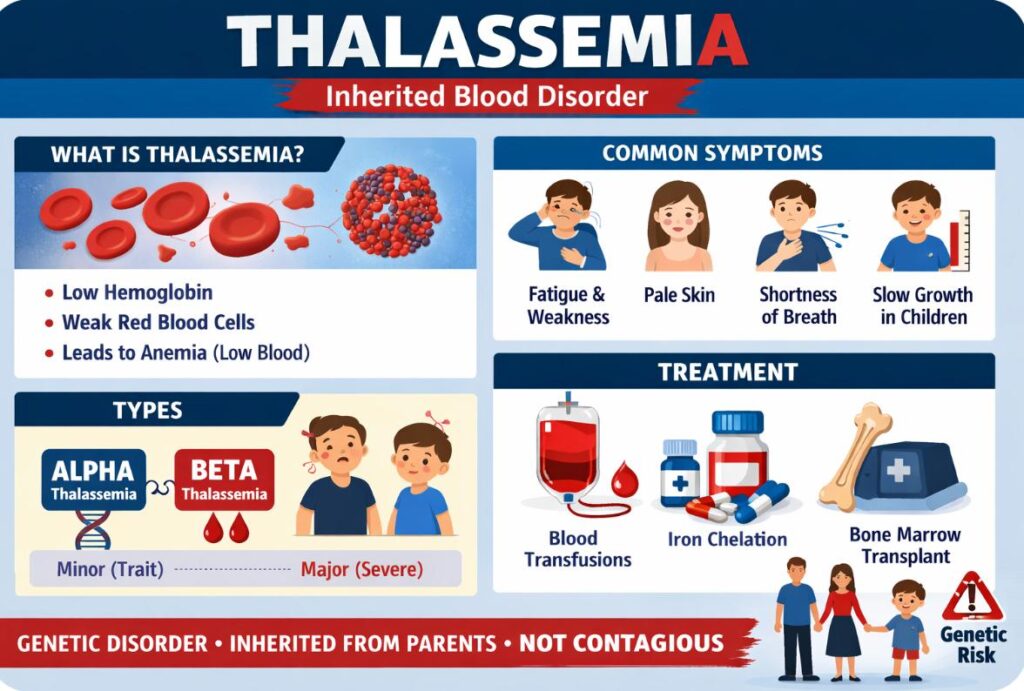 Thalassemia is a genetic blood disorder that affects how the body produces hemoglobin, leading to a shortage of healthy red blood cells. This results in mild to severe anemia, causing chronic fatigue, weakness, and potential organ damage over time.